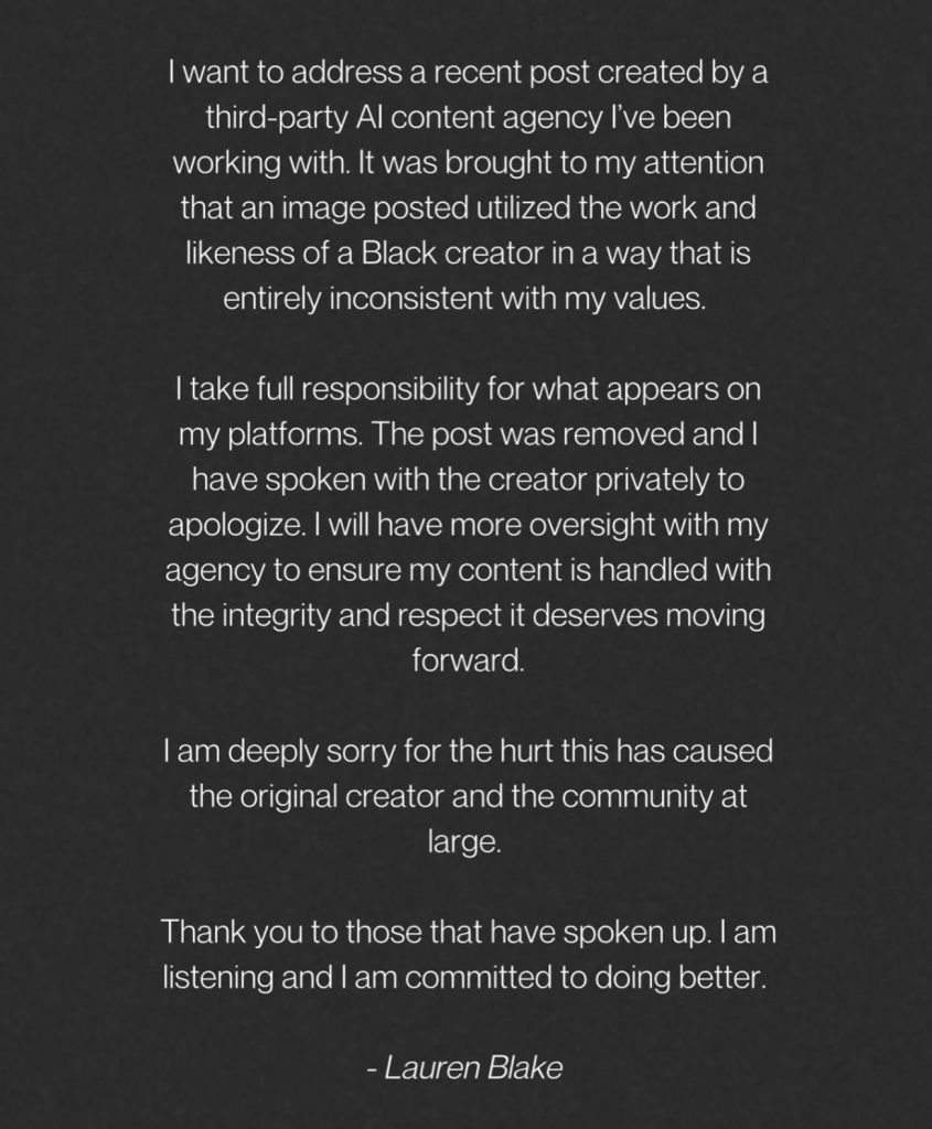 After the controversy spread, Lauren Blake Boultier issued a public response. She accepted responsibility and said the image came from an AI content system used by her team.