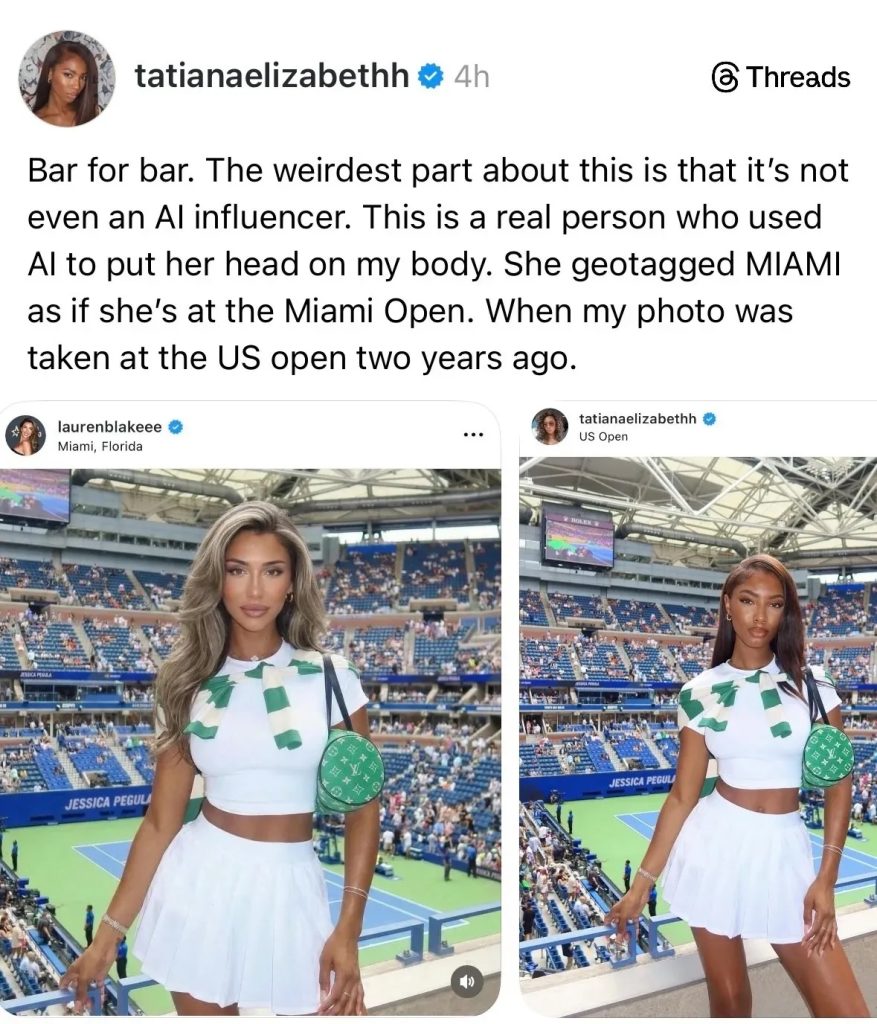 Tatiana Elizabeth first noticed the issue when she saw a nearly identical version of her 2024 US Open photo on Boultier’s Instagram. The outfit, pose, handbag, and even wrist tattoo matched perfectly. Only the face looked different.